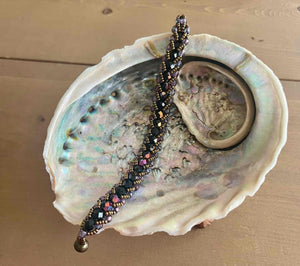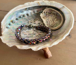 Wat een prachtige warme en mysterieuze uitstraling heeft deze armband! De combinatie van diepzwarte(glas)kralen met koper-bronsen paarsachtige accenten roept een gevoel op van luxe, avondgloed en magie.