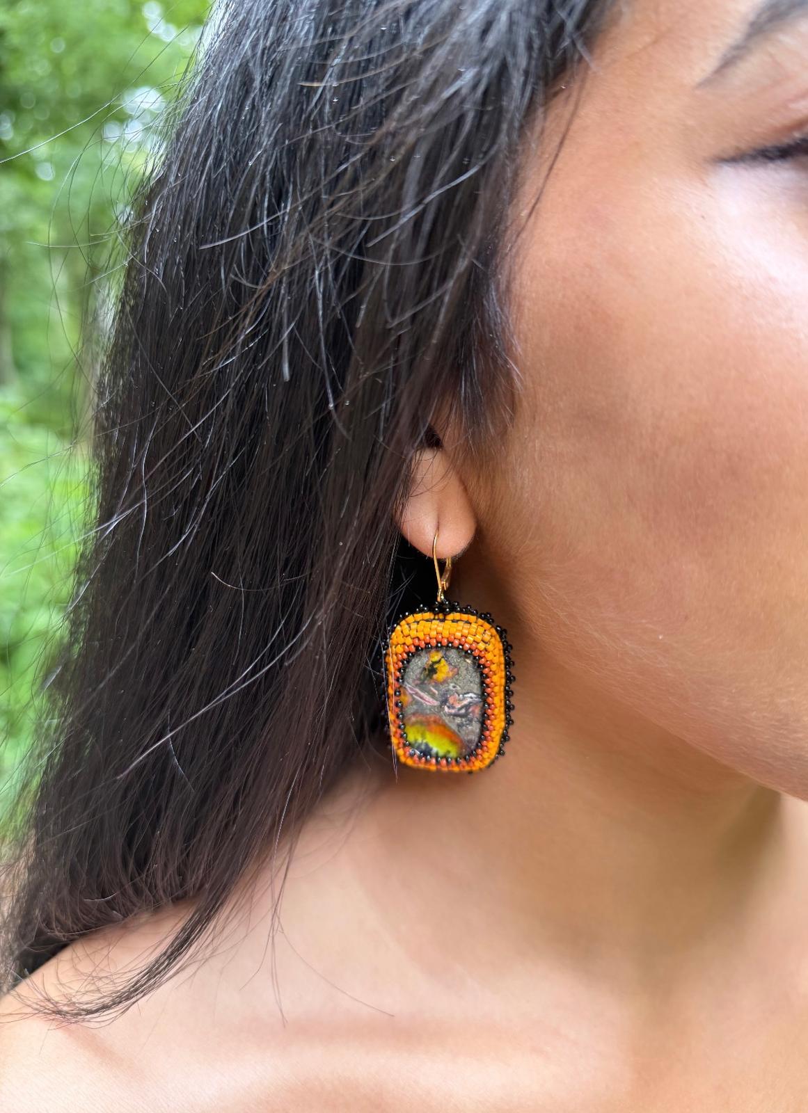 De oorbellen zijn gemaakt van Miyuki en Toho glaskraaltjes en edelsteen. De oorbellen dragen niet zwaar en de achterkant is afgewerkt met zwart Ultrasuede. De oorhaakjes zijn goudkleurig en de techniek die ik gebruikte is Bead Embroidery.