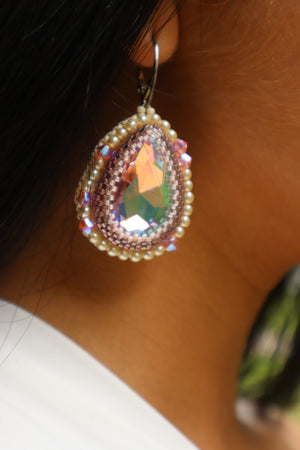 Mooie oorbellen met roze Swarovski druppels, die schitteren in het zonlicht.